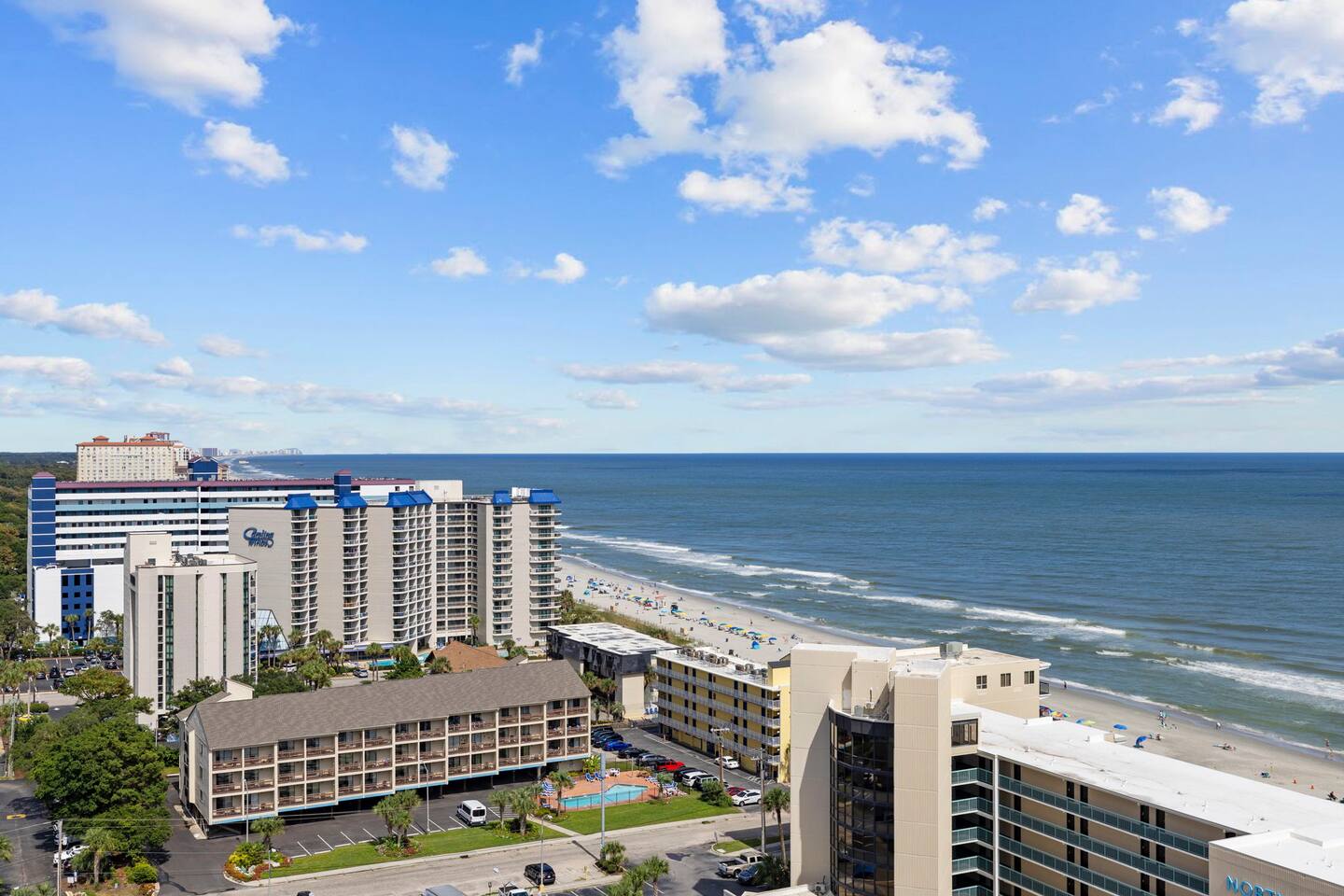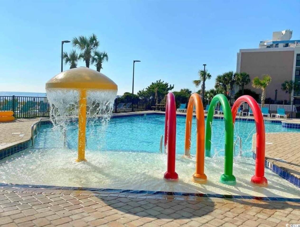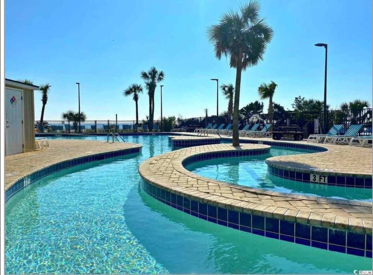 Guests have access to all of the standard water amenities (indoor and outdoor pools, lazy river, hot tubs that are located next to and behind the oceanfront building). The mini waterpark between the building and Ocean Blvd. and fun zone pool area are owned and operated by on-site hotel management, and their guests pay an extra resort fee for exclusive access. Guests renting privately are unable to access these areas. With the money you save, you can take the family to a real waterpark. We recommend Myrtle Waves or Wild Water Wheels.
